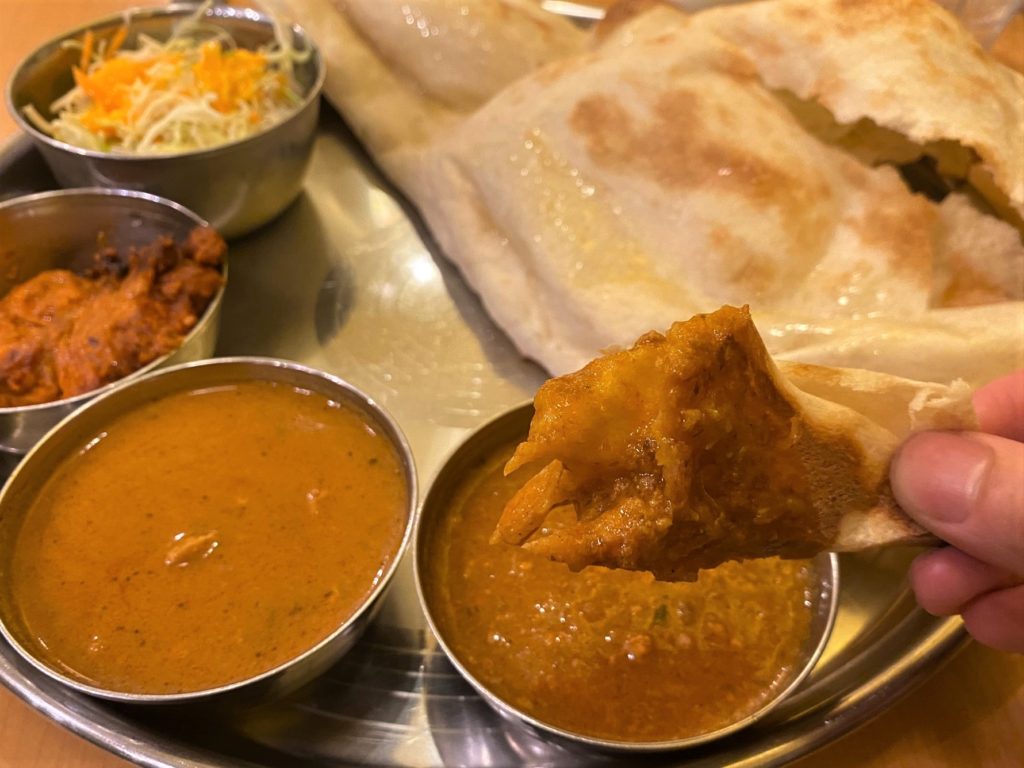 2種のカレーは、どちらもとろみが少ないシャバシャバ系。チキンカレーは鶏肉が1つ、キーマも肉感は少ないのでナンに乗せてというよりも浸して食べるカレーです。2種ともに辛口のカレーにしましたがそこまで辛くなく、甘めのナンなので刺激は少なめ。