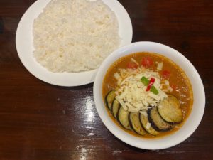 カレーの種類はチキンやエビ、大豆とひよこ豆があり、辛さは1~10まで調整可能。1番で一般の中辛、2番で辛口、草枕のおススメは3番ですが、辛さに耐性がある人は5番以降が良いそうです。